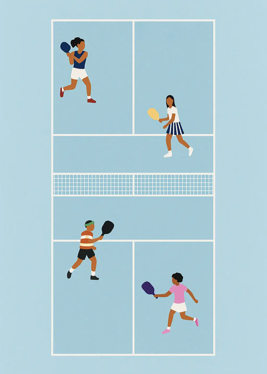Le Pickleball est un sport de raquette dynamique et accessible, né à la croisée du tennis, du badminton et du ping-pong. Il se joue en simple (1 contre 1) ou en double (2 contre 2), sur un terrain plus petit qu’un court de tennis, avec une raquette rigide (paddle) et une balle en plastique perforée.
